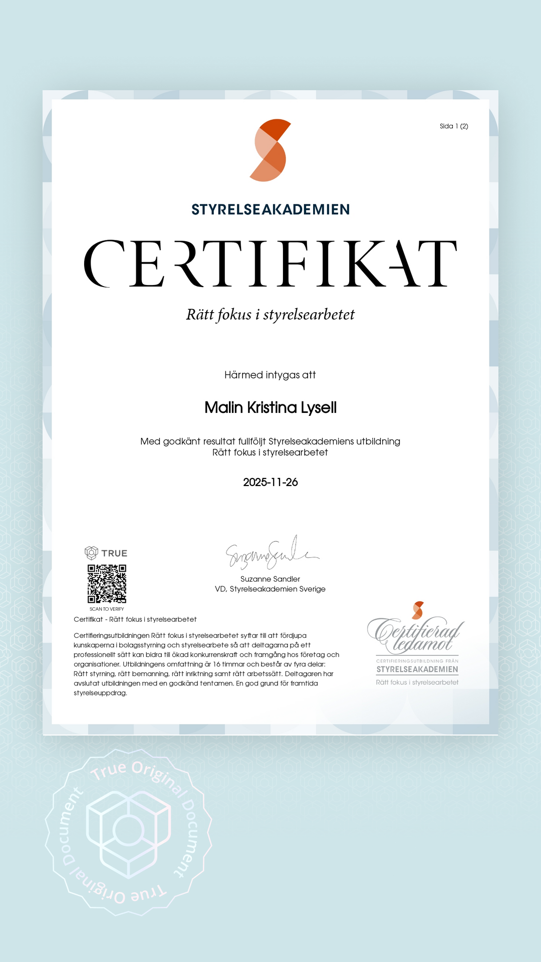 Alla TRUE -document är säkrade med blockchain-teknologi och kan verifieras som äkta. Klicka på verifieringsknappen bredvid dokumentet eller skanna QR-koden med din smartphones kamera. Ingen app krävs - dokumentets äkthet verifieras omedelbart.